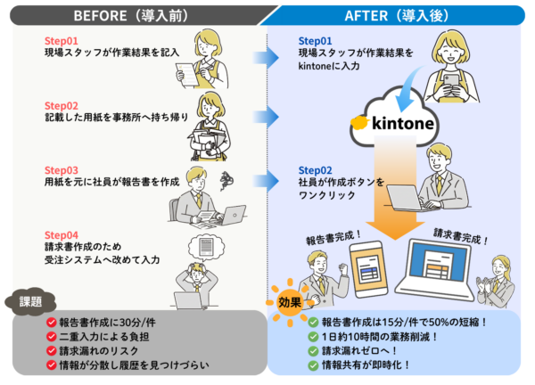 kintone の導入により、報告書作成業務は大幅に効率化されました。従来は1件あたり約30分かかっていた報告書作成が、現在ではおよそ15分で完了できるようになっています。1日に約40件の作業が発生するため、1日あたり約10時間もの業務時間削減につながっています。さらに、現場から会社へ戻る前に報告内容を確認できるようになったことで、業務全体のスピードアップにも寄与しています。
